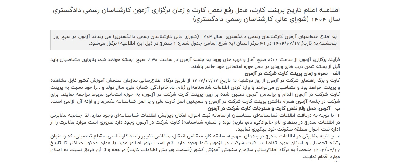اطلاعیه اعلام تاریخ پرینت كارت، محل رفع نقص كارت و زمان برگزاری آزمون معوق متقاضیان اخذ پروانه كارشناسی رسمی دادگستری مركز وكلا، كارشناسان رسمی و مشاوران خانواده قوه قضائیه - سال1404